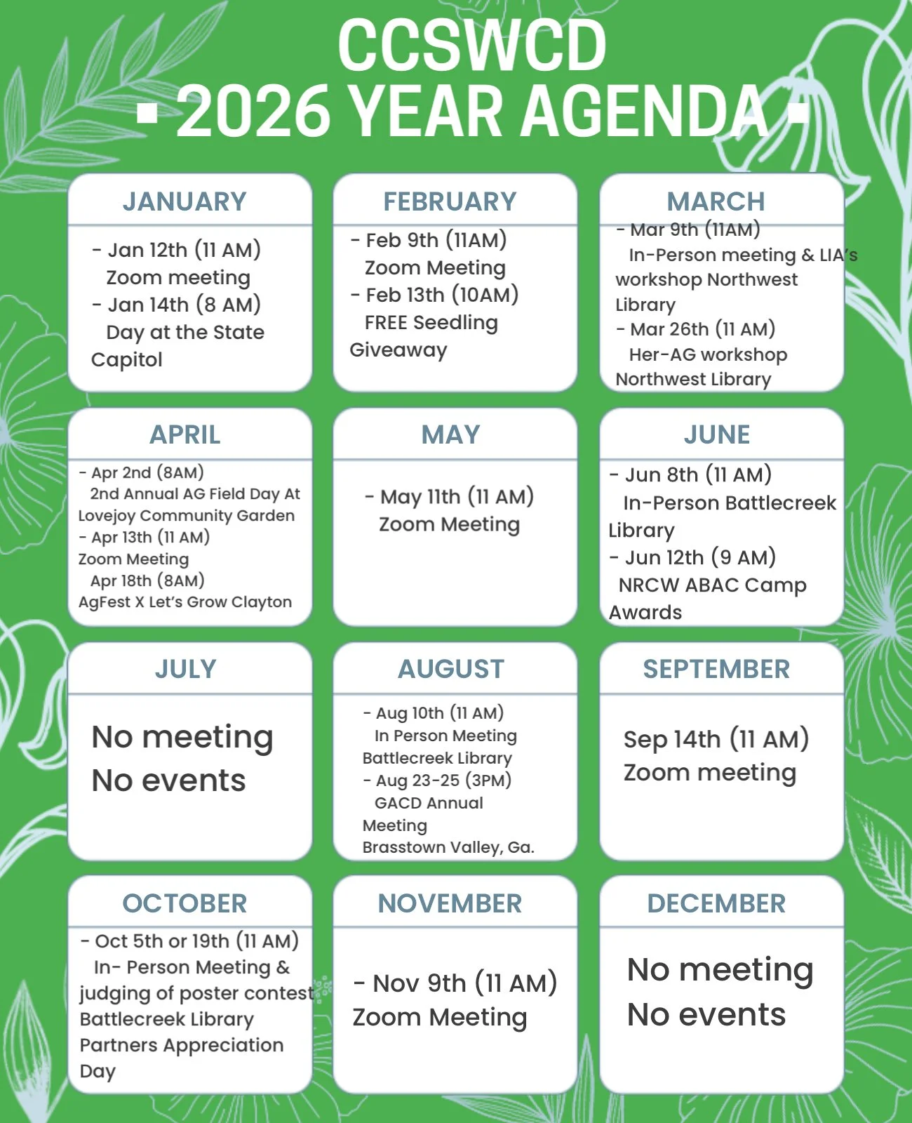 The Clayton County Conservation District meets on the second Monday of each month at 11 AM typically via conference call/Zoom, but one meeting per quarter is held at the Clayton County Headquarters Battle Creek Library at 865 Battle Creek Road, Jonesboro, Ga 30236 unless noted otherwise. The 2026 meeting dates are below, but are subject to change. Please email info@gacd.us or contact us at the bottom of this page to be added to the district’s monthly meeting notice email list and receive the monthly Zoom invitation link.