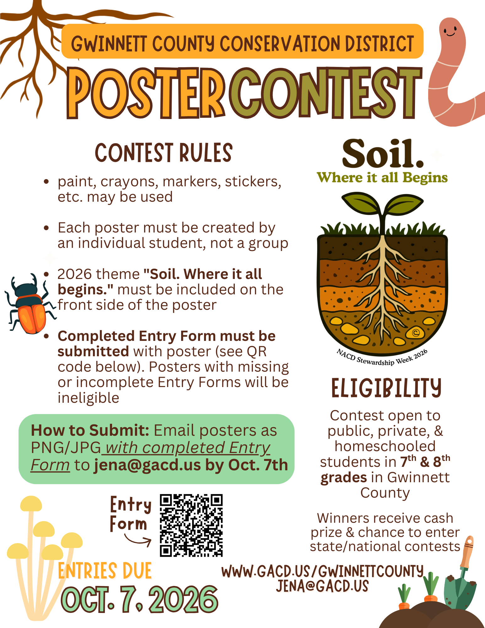 Each year we host an art poster contest with a stewardship theme that highlights the work conservation districts do in relation to natural resources conservation. The winner of our local contest has a chance to move on to the state and national level contests. The 2026 Stewardship Theme is “Soil. Where It All Begins”. The deadline to submit entries is October 7, 2026. Entries must be emailed to jena@gacd.us. More info can be found on the flyer below.