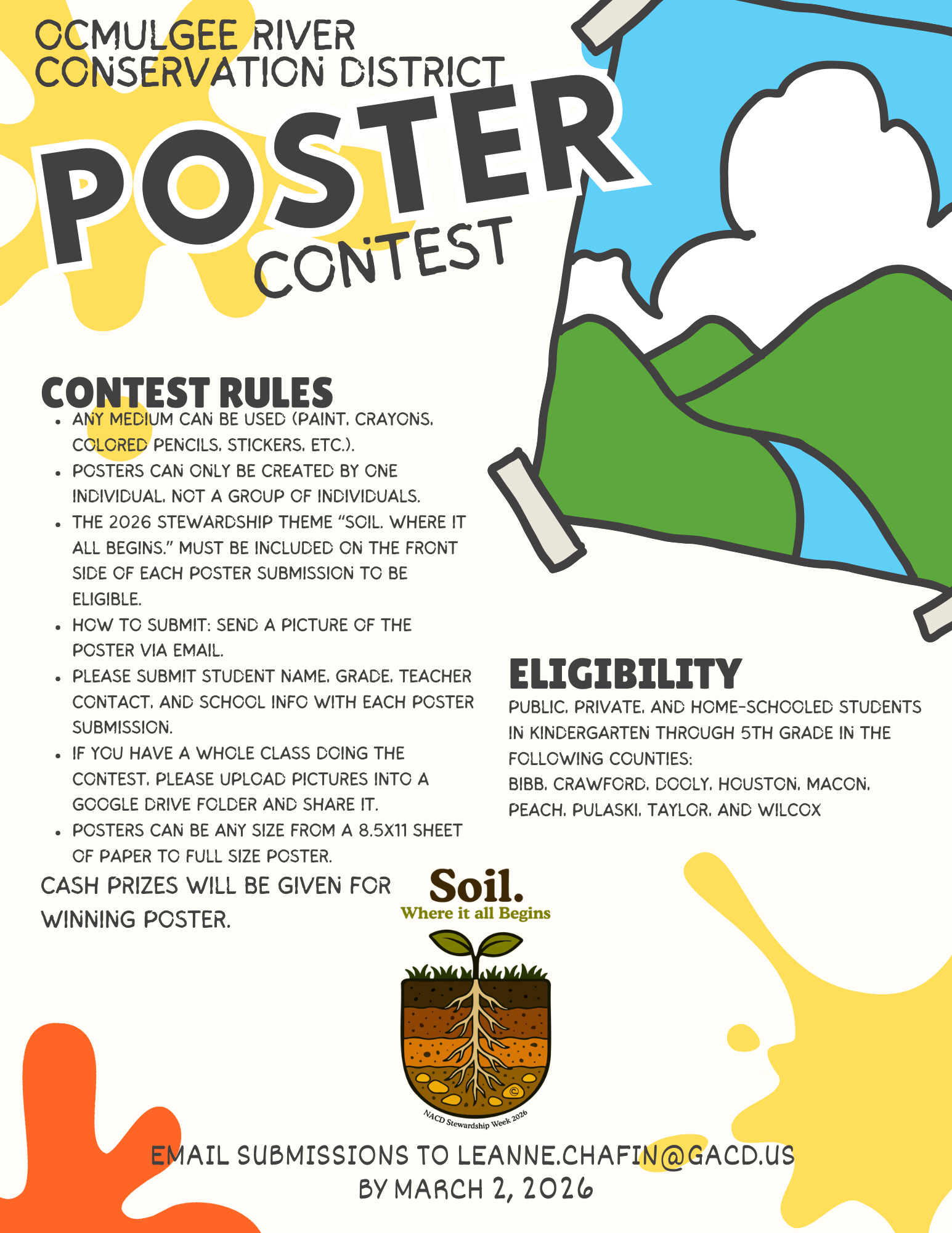 Perry, GA January 21, 2026—The Ocmulgee River Soil and Water Conservation District (SWCD), a local agency dedicated to the conservation and stewardship of the area’s natural resources, is now accepting entries for their Poster Contest for students located within the District’s service area. The service area includes Bibb, Crawford, Dooly, Houston, Macon, Peach, Pulaski, Taylor, and Wilcox counties. Education is a critical element of the conservation effort at the local, state and national levels. Educating young people about the benefits of conservation helps to ensure the next generation will be wise stewards of America’s natural resources.